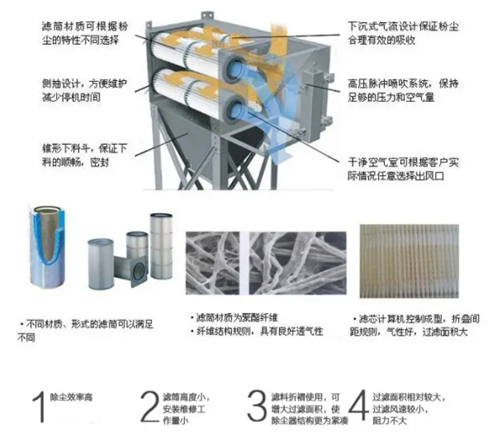 濾筒除塵器按濾筒材料分,可以分為長(zhǎng)纖維聚酯濾筒除塵器,復(fù)合纖維濾筒除塵器,防靜電濾筒除塵器,阻燃濾筒除塵器,覆膜濾筒除塵器,納米濾筒除塵器等。