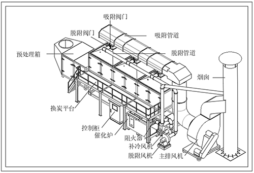 首先有機廢氣在風(fēng)機的作用下有機廢氣送入活性炭吸附箱進行吸附凈化,凈化后的潔凈氣體由主排風(fēng)機排入大氣中。吸附裝置配有備用吸附箱1套,當活性炭吸附飽和后通過控制閥門切換至催化燃燒脫附狀態(tài);脫附再生系統(tǒng)采用在線脫附再生,即吸附過程為連續(xù)式處理工藝,在備用吸附裝置投入使用同時,飽和吸附箱則進行脫附工作,脫附后活性炭箱預(yù)備至下次循環(huán)使用。